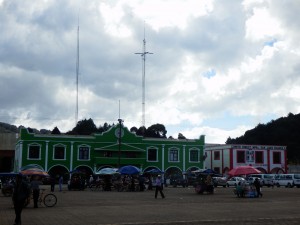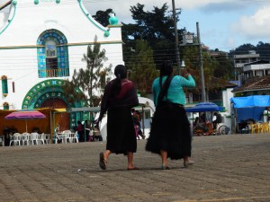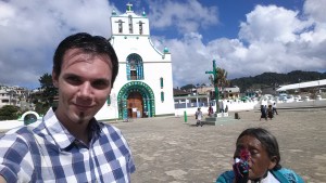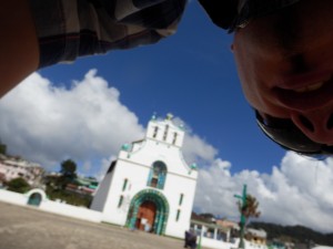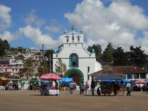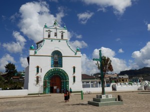 Imaginez cette église blanche, décorée de vert et bleu. En entrant aucun banc ni mobilier habituel. la totalité du sol est recouvert d’aiguilles de sapin. Tout autour des statues de saints chrétiens devant lesquels se trouvent des tables avec des centaines de bougies. Les Mayas sont au sol en face de plusieurs rangées de mini bougies que le prêtre particulier a hérigé. Les prêtres Mayas frottent eau, oeuf ou os sur la personne venue se faire bénir. Certains ramènent une poule à sacrifier ou non.